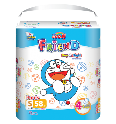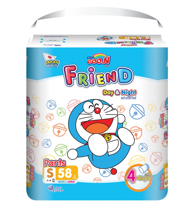 GOO.N Friend (Doraemon) diapers is the economy line of GOO.N that comes in pants variant only. It can absorb up to 4-cups of urine best for day & night use.